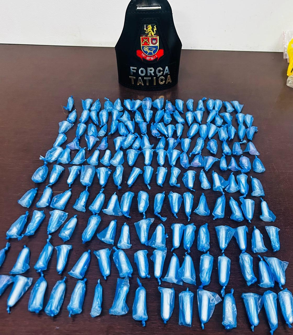 Já no Condomínio Vida Nova 2, na região da Praia Azul, após uma denúncia, a equipe da Força Tática, sargento Leandro, cabo Patrick e soldado Marco, seguiu para um apartamento e homem, de 22 anos, foi abordado. Em seguida, os agentes observaram a tela de uma janela cortada e do lado externo foi encontrada uma sacola com 166 pinos com cocaína. No imóvel, tamnbém foram localizadas mais duas unidades da mesma droga.