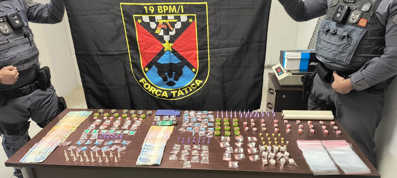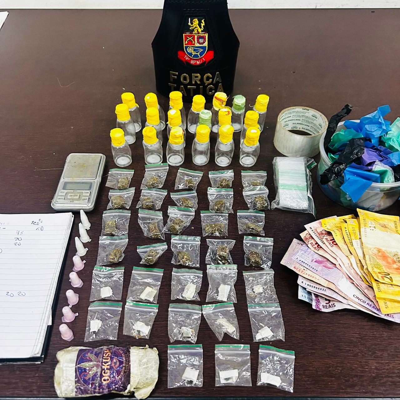 Após uma denúncia, a equipe da FT, sargento Leandro, cabo Patick e soldado Marco, seguiu para uma residência, na Rua do Pica-Pau, e um homem, de 48 anos, foi abordado. Segundo a PM, ele admitiu o armazenamento de drogas na casa. Em seguida, os agentes entraram no imóvel e localizaram 42 porções entre cocaina, dry e maconha, além de 19 frascos de lança-perfume.